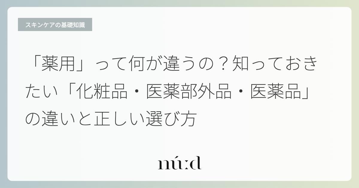 実は、私たちが普段肌に使っている製品は、法律(医薬品医療機器等法、旧薬事法)によって「化粧品」「医薬部外品」「医薬品」の3つに明確に分類されています。