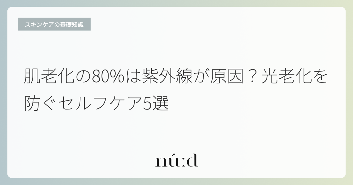 「シミやシワは年齢のせい」と思っていませんか。実は、目に見える肌老化の約80%は紫外線の蓄積ダメージ——いわゆる「光老化」が原因とされています。裏を返せば、紫外線対策を徹底すれば肌の老化はかなりコントロールできるということ。この記事では、光老化のメカニズムから、今日から始められるセルフケア5つのポイントまでを、科学的な視点で解説します。