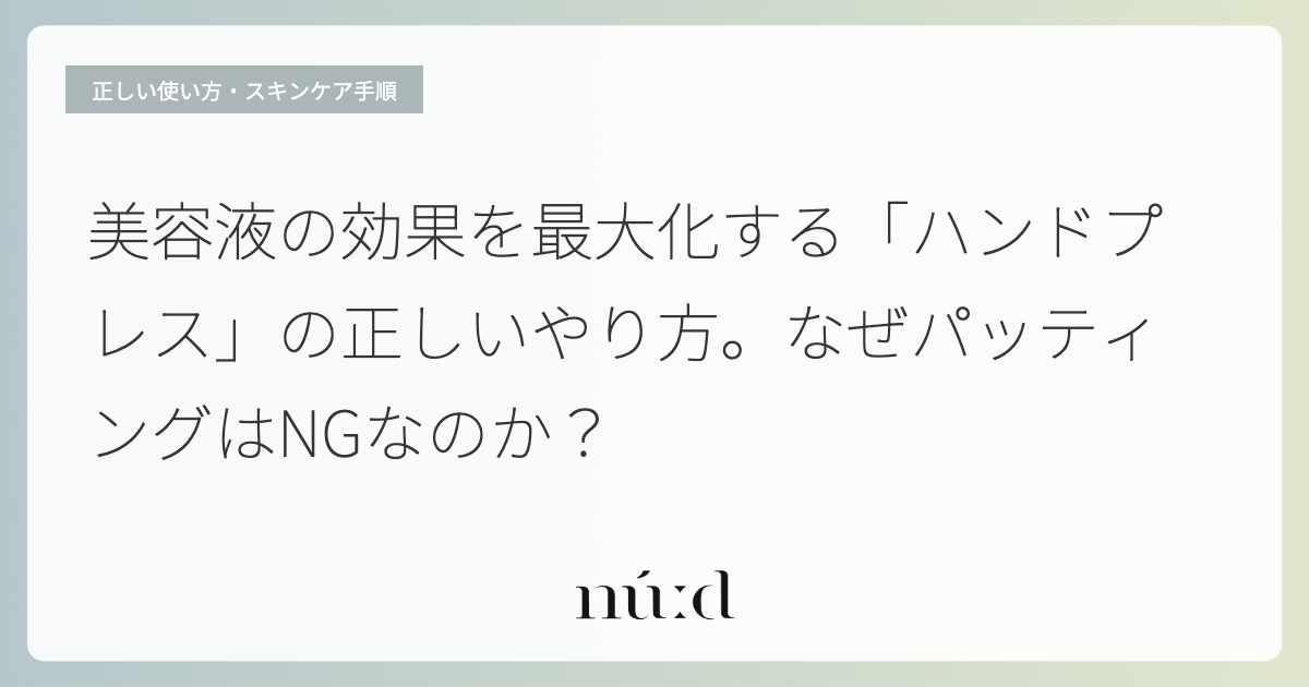 この記事では、なぜパッティングや摩擦がNGなのかという理由と、美容液の効果を最大化するための正しいハンドプレスのやり方について、皮膚科学的な視点を交えて解説します。