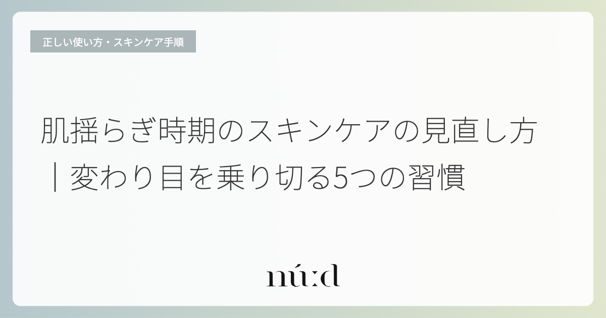 肌揺らぎ期は、洗顔の見直し、洗顔後のすみやかな保湿、紫外線対策、新製品の試し方、睡眠・食事・ストレスのケアの五つを習慣にすると乗り切りやすい。まずは土台を整え、季節の変わり目に肌が荒れる「ゆらぎ肌」の記事で、揺らぎ期向けの美容液の考え方も参考にしてみてほしい。素の肌を信じて、無理のないペースで続けよう。